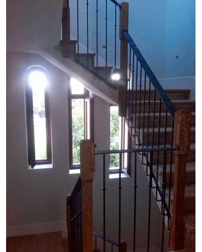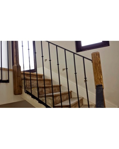 Barandilla de escaleras ref. 101131. Magnífica barandilla de escaleras para  plantas de edificos, duplex, etc.... Esta formada por barrotes de hierro forjado en linea vertical, macollaas en el centro. El pasamano es una superficie plana de hierro, en cuyos extremos encontramos postes de madera En su parte inferior esta sujeta al forjado de la escalera mediante una pletina, en la que estan soldados todos los balaustres.