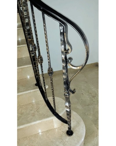 Este modelo que presentamos, tiene un acabado envejecido, dándole un toque de mayor artesanía y rusticidad. Finaliza en una columna, con adornos semicirculares del pasamanos