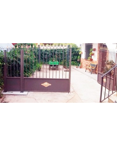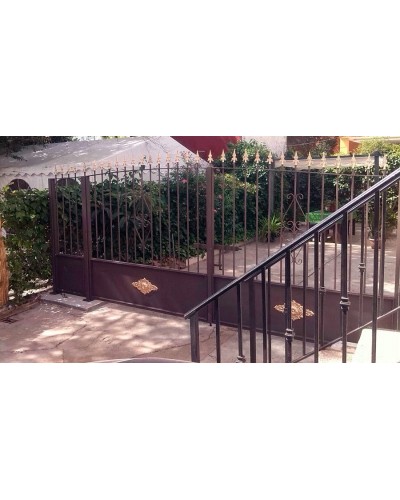 Cancela de forja ref. 101134. Maravillosa cancela de hierro forjado, compuesta por barrotes de hierro terminados en forma de lanzas muy pronunciada y en dorados, para dar un toque de luminosidad y brillo. En su parte inferior lleva un zocalo de hierro en el cual hemos puesto unos adornos de fundicion teminados en oro,
