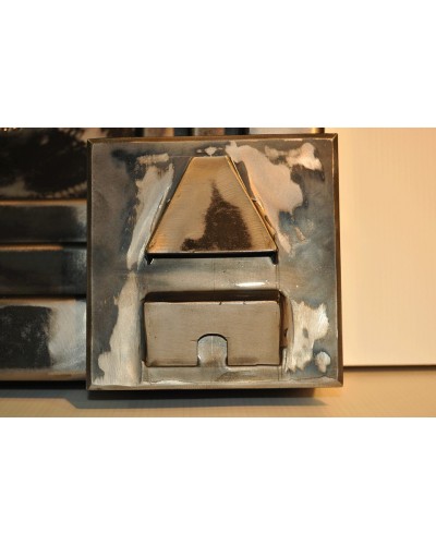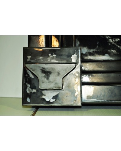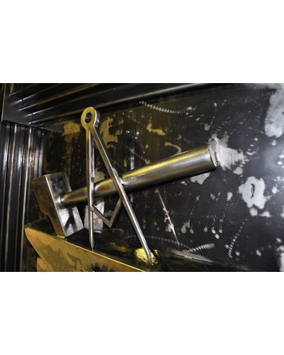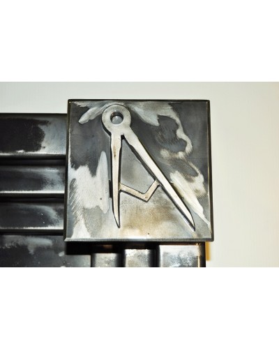 Cuadro de forja ref: 101189. cuadro de forja, en cuyo centro encontramos un gran yunque, un gracioso martillo y un compás. En cada una de las esquinas tenemos un elemento de herrería, como un yunque, un compás, un martillo, y una fragua. El marco de este cuadro esta elaborado con chapa plegada. Se puede apreciar, un grabado en dorado.