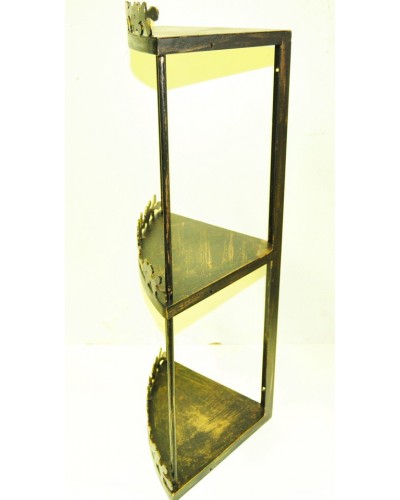 Estantería rinconera de forja ref.101259, compuesta por tres baldas en forma triangular, unidas todas ellas con barrotes de hierro. En la parte delantera lleva una cenefa de aornos simulando hojas.