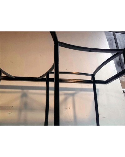 Mesa de forja ref.101138. Estupenda mesa de forja, con forma cuadrada. Elaborada con ocho patas unidas todas ellas con, barrotes semicirculares en cuyo medio se encuentra un círculo. En la parte superior de dicha mesa, encontramos unos adornos de barrotes verticales con forma semicircular, y otros en forma horizontal.