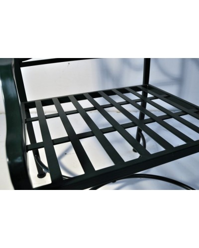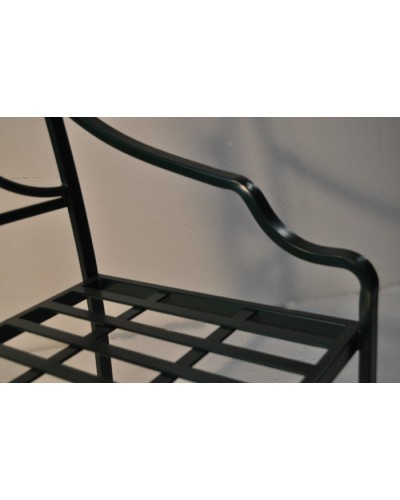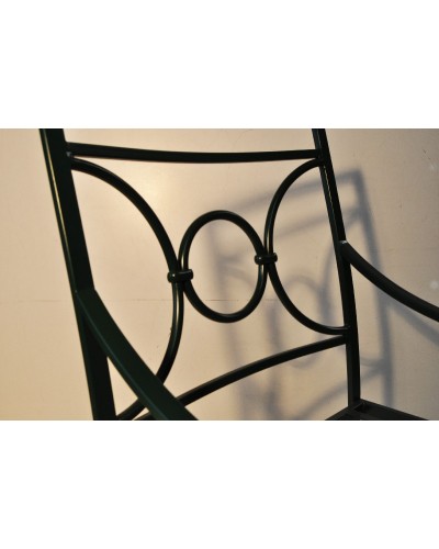 Sillón de forja ref. 101151. Estupendo sillón de forja, compuesto por cuatro patas terminadas sobre una base circular. Dichas patas se unen mediante un semicirculo unidos ambos por una abrazadera. En el respaldo, encontramos unos adornos semicirculares en cuyo medio se encuentra un círculo. De dicho respaldo, salen los reposabrazos realizando una figura en línea recta. La base de dicho sillón, esta formada por cuadrdados de hierro. Como opcion podemos incluir el cojin y hacerlo para 1, 2 ó 3 cuerpos.